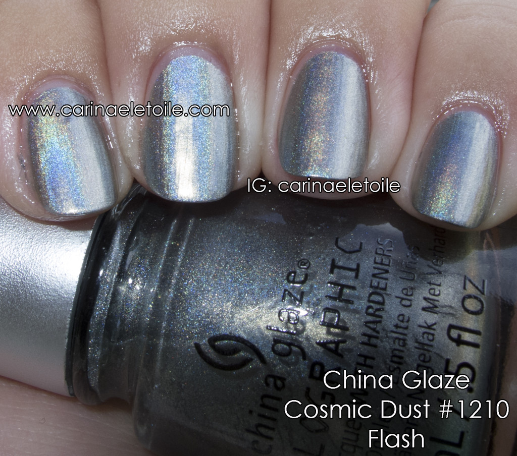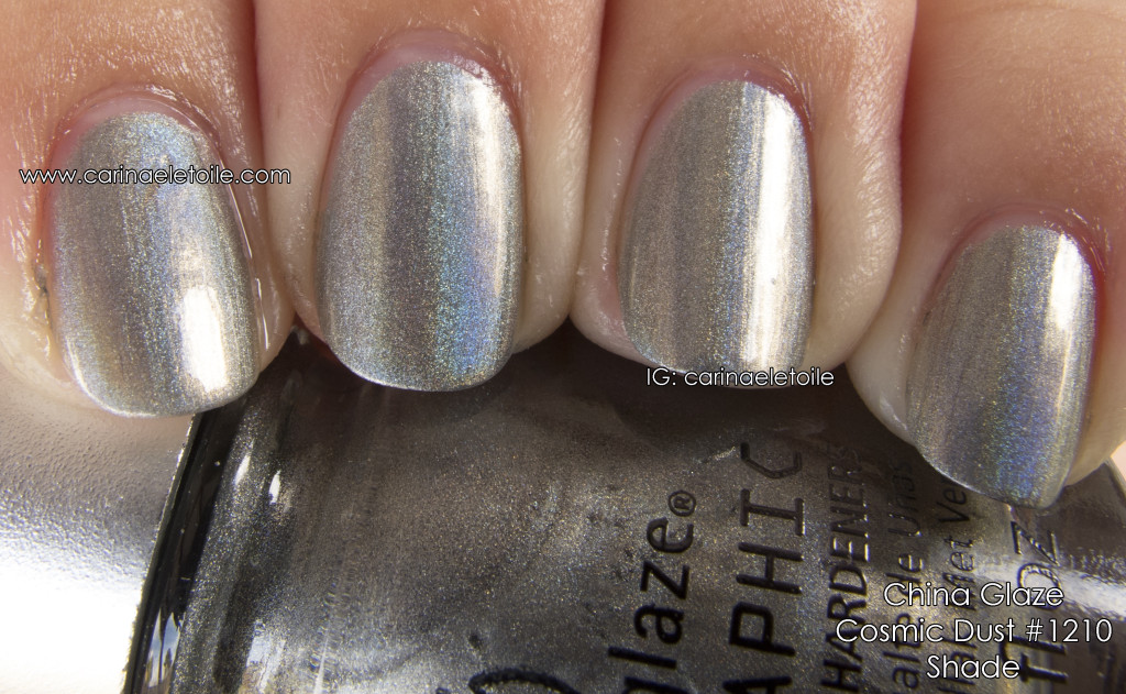 Cosmic Dust out of the China Glaze Hologlam collection could be viewed as a dark gray holo. While it’s not as dark as I’d like it to be, it’s still very pretty and shows flash and attitude!