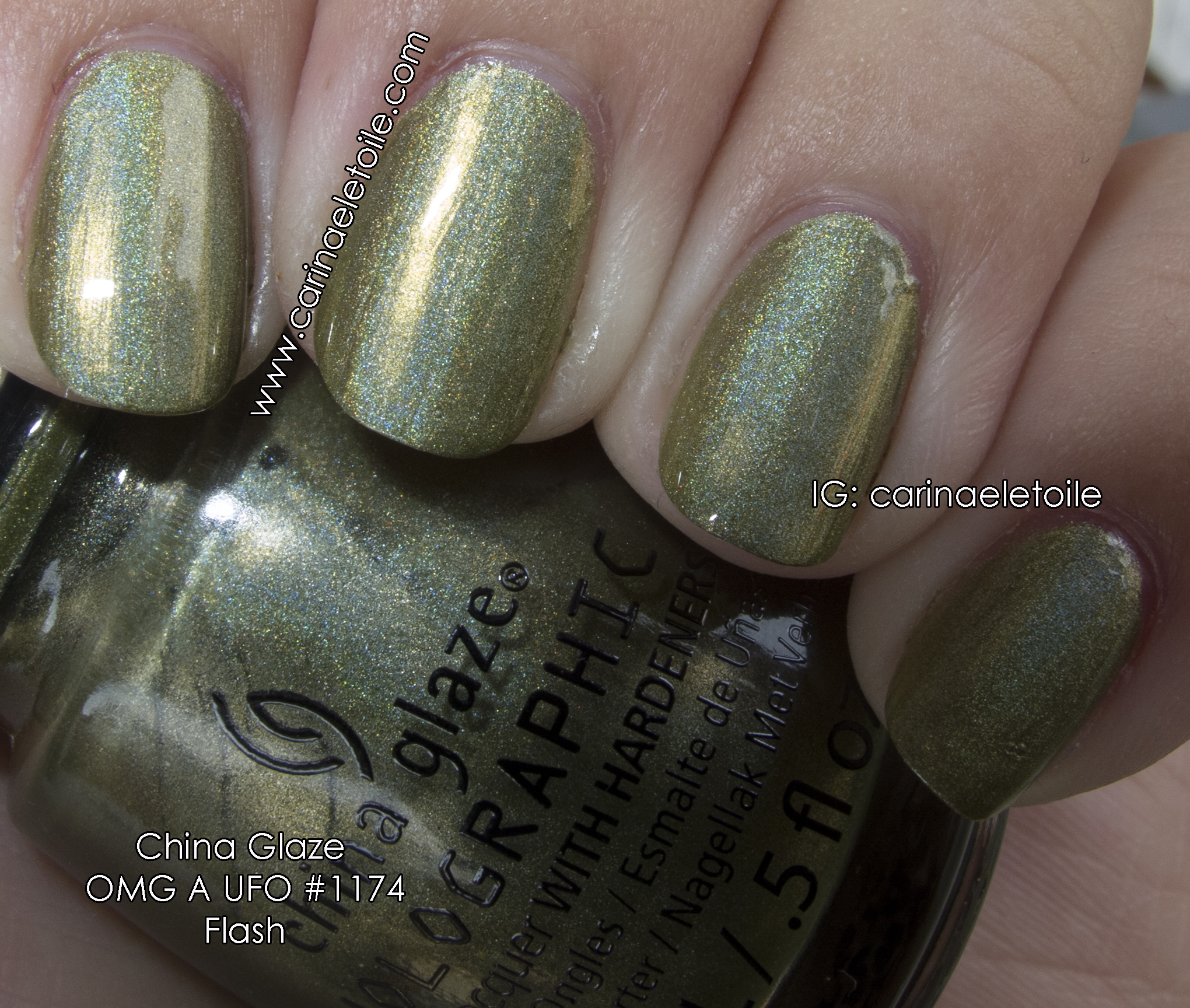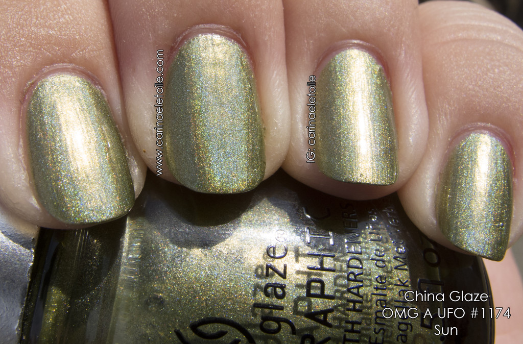 OMG A UFO isn’t quite like L8R G8R from the OMG collection, but it’s a bit deeper and prettier. L8R G8R was a lime color while this is the more grown up, adult version. The holo is barely discernible, but it does come out and play here and there. You just have to be in the right light for it to happen.