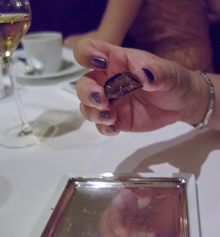 While nine courses are listed, it truly felt like we had been served fourteen. I didn’t count the breads in between the courses, nor did I include the palate cleanser between Course 8 and 9. There were also sweets before Course 9, then Course 9 itself and then came out the chocolate truffles…and then the coffee and donuts…and then the toffee glazed chocolate macadamia nuts. Mercifully that ended the meal, but still – so much food for FOUR hours.