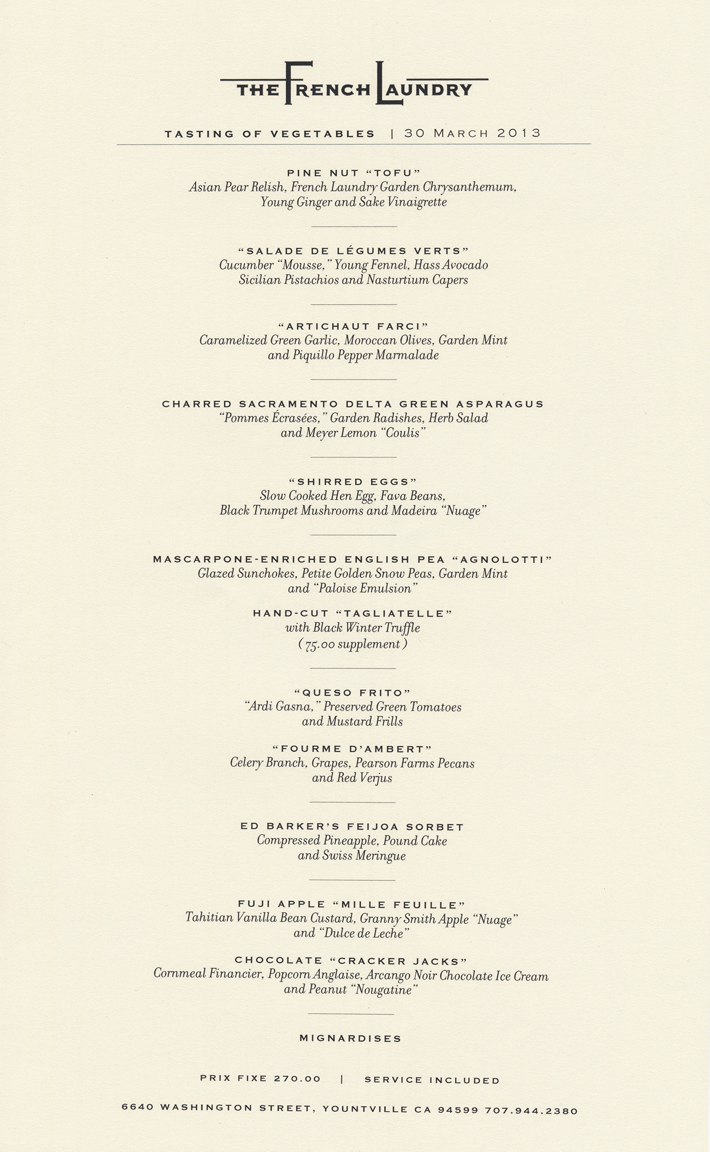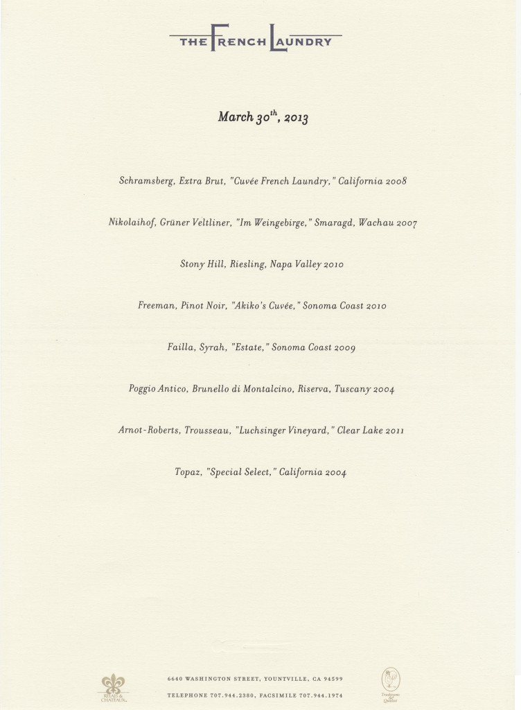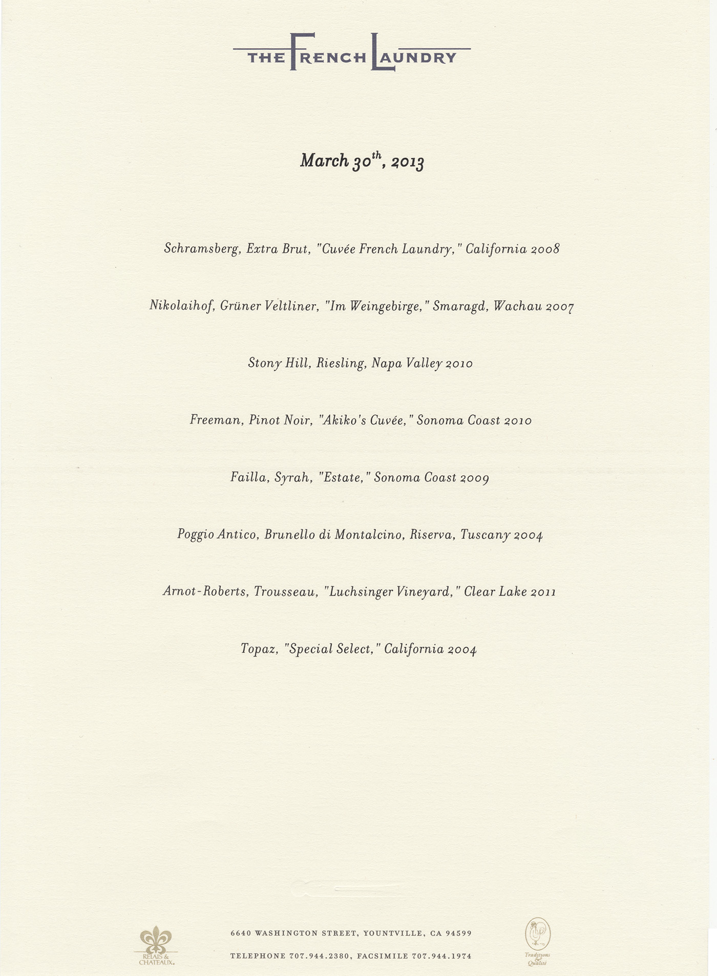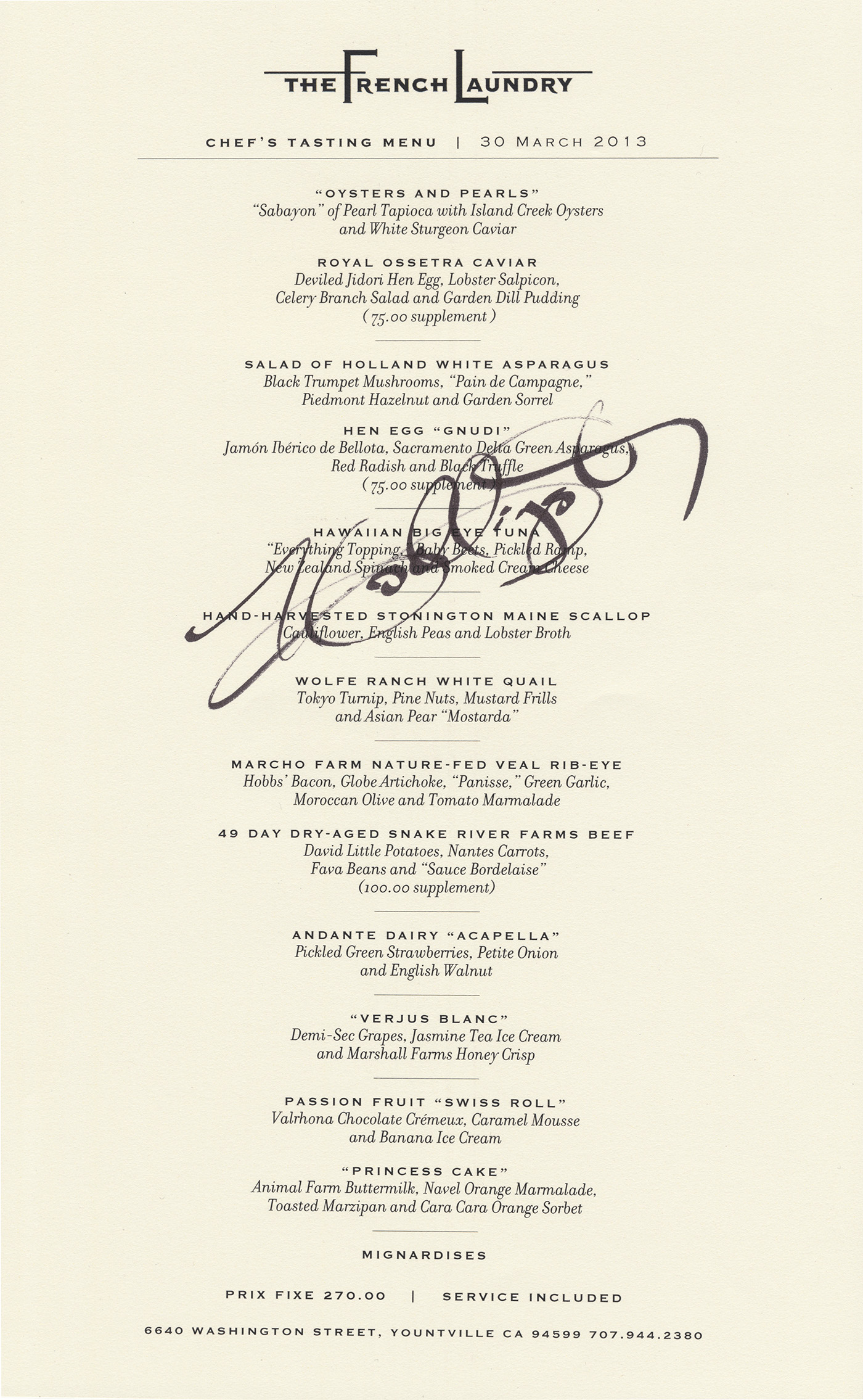 The French Laundry – Chef’s Tasting, which is the menu I chose. Autographed by Timothy Hollingsworth, the Chef de Cuisine. No Thomas Keller, though…it’s cool.