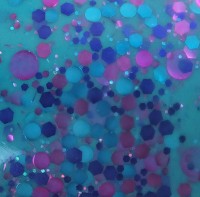 KB Shimmer is described on the site “…as almost teal blue green color, the fuchsia circles in two sizes, aqua circles, and other hex glitters in different colors and sizes.”