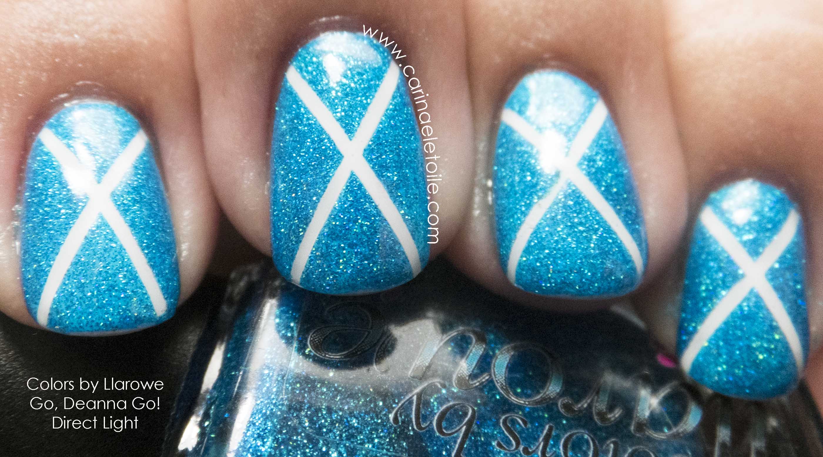 I decided to use Colors by Llarowe Go, Deanna Go! for a mani of the Scottish flag. Isn’t the Flag of Scotland super duper pretty? It’s known as the Saltire and Saint Andrew’s Cross. In case you didn’t know, the patron saint of Scotland is St. Andrew. Did you also know that the official color for the Saltire is Pantone 300?