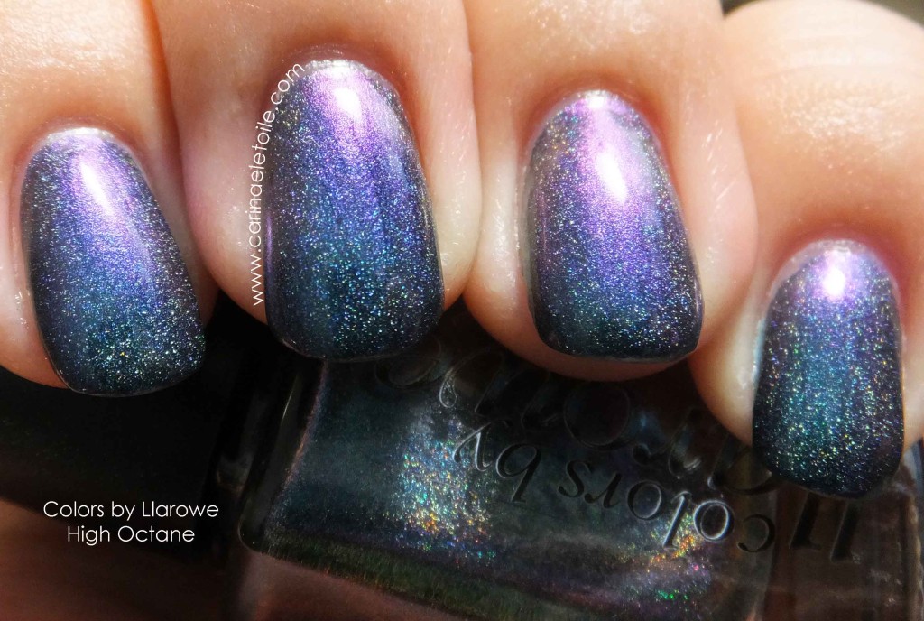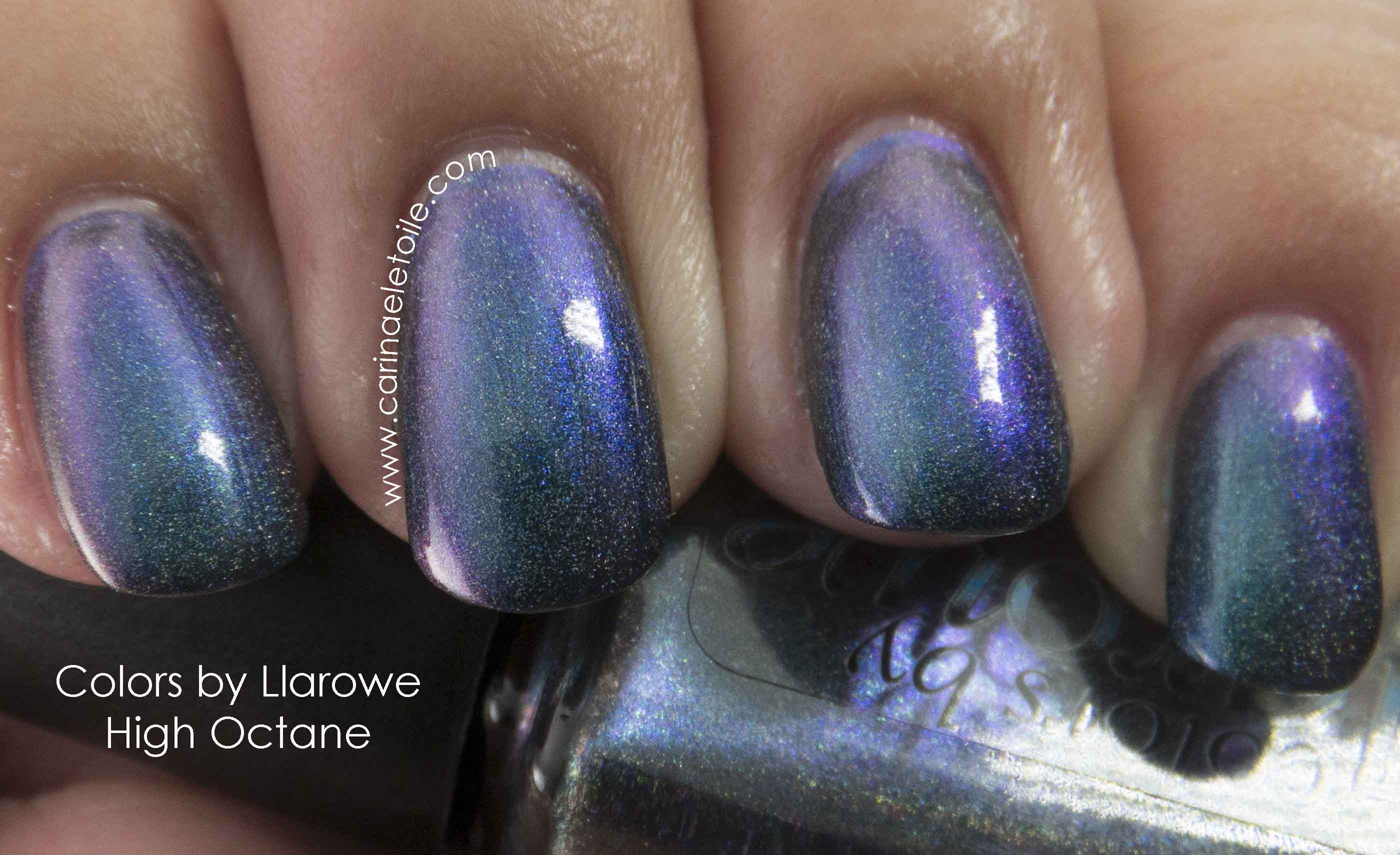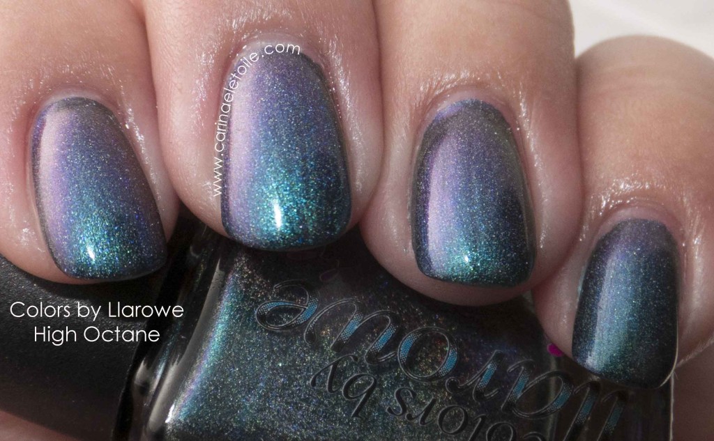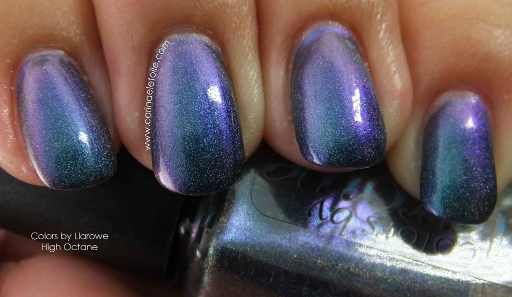I am now going to show you Colors by Llarowe High Octane. Out of the six colors, this is one of my top favorites. It’s a bit of a Holy Grail of Unicorn farts, in my opinion. It excels where others have tried to do something like this and have failed. A big, miserable fail. All the previous iterations were practice runs for everyone and Leah Ann really shows other Indies how it should be done Why is it so gorgeous? Well, it’s a deep teal blue/green with a purple duochrome flash and…a holo. Mind blown. Head explodes. It’s freakin’ gorgeous. Then, to make it even crazier, this was a limited edition, one off thing. If you were lucky to score it, hoard it. Don’t let it see sunlight, don’t let anyone else see the bottle. Keep it elusive. Keep it hidden, hear me? I’m keeping mine hidden, that’s for sure. Of course, I’ll probably forget where it is. So typical of me.