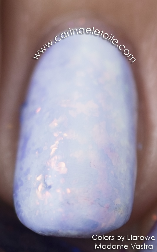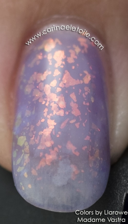 I love this particular color out of the collection. It’s my favorite, to be honest. I’m a sucker for purple and this is such a chameleon! Please note that I sponged these flakies on my nail. I simply put one coat down, let it dry for about five minutes, then took a cosmetic sponge and painted on a coat on to the sponge. Then I sponged the color and flakes on to my nail. After I put another coat of Colors by Llarowe Madame Vastra on for good measure and the lovely purple tinted base. That was it!