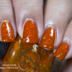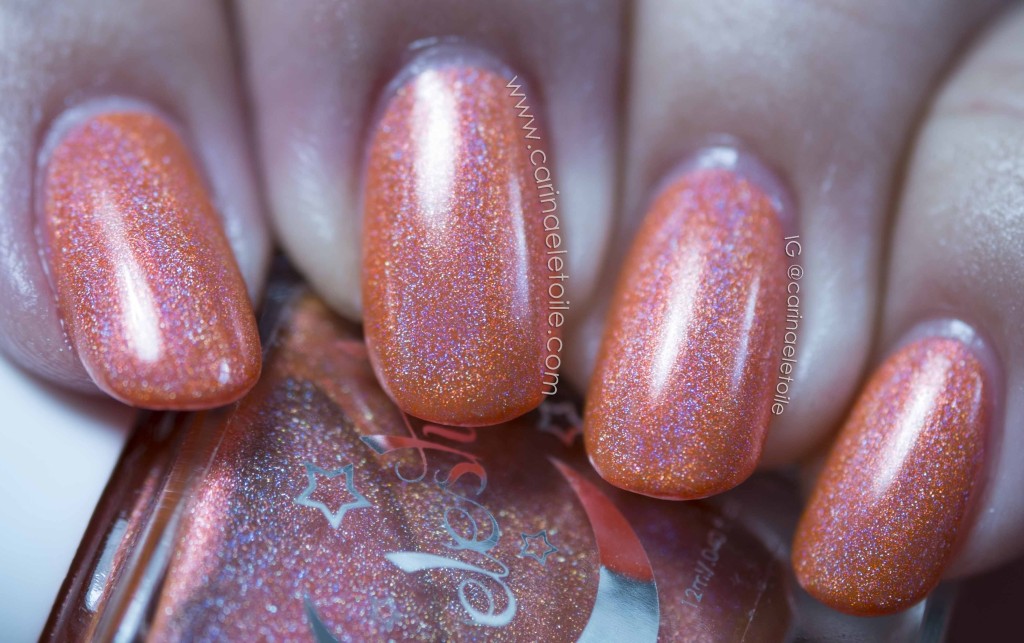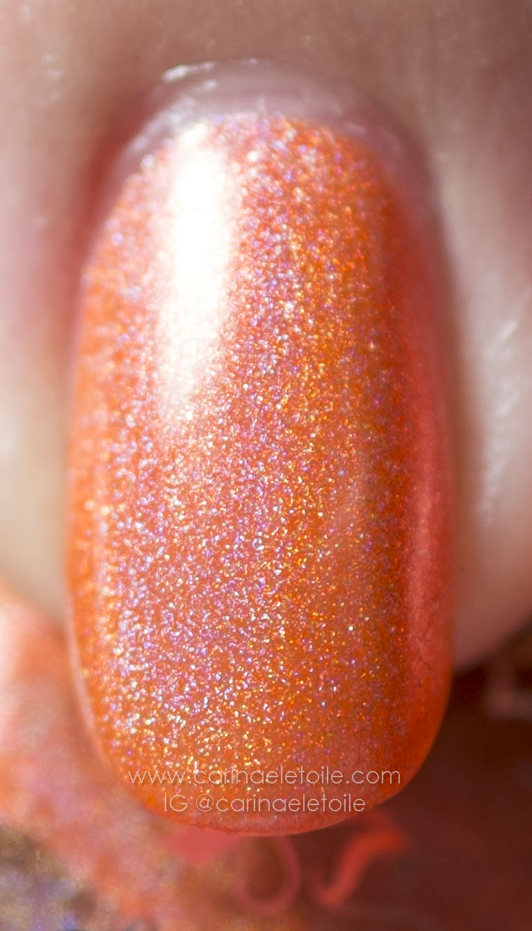 I found this color to be quite pretty and a bit unusual. It is not often that you find an orange neon-leaning holographic. While not the best, it’s well executed. I was hesitant at first because it didn’t look spectacular nor appealing when just looking at the bottle. However, once on the nail, Celestial Cosmetics Tantrum looked just like it did in the bottle, but there was a subtle shift that suddenly made this very pretty.