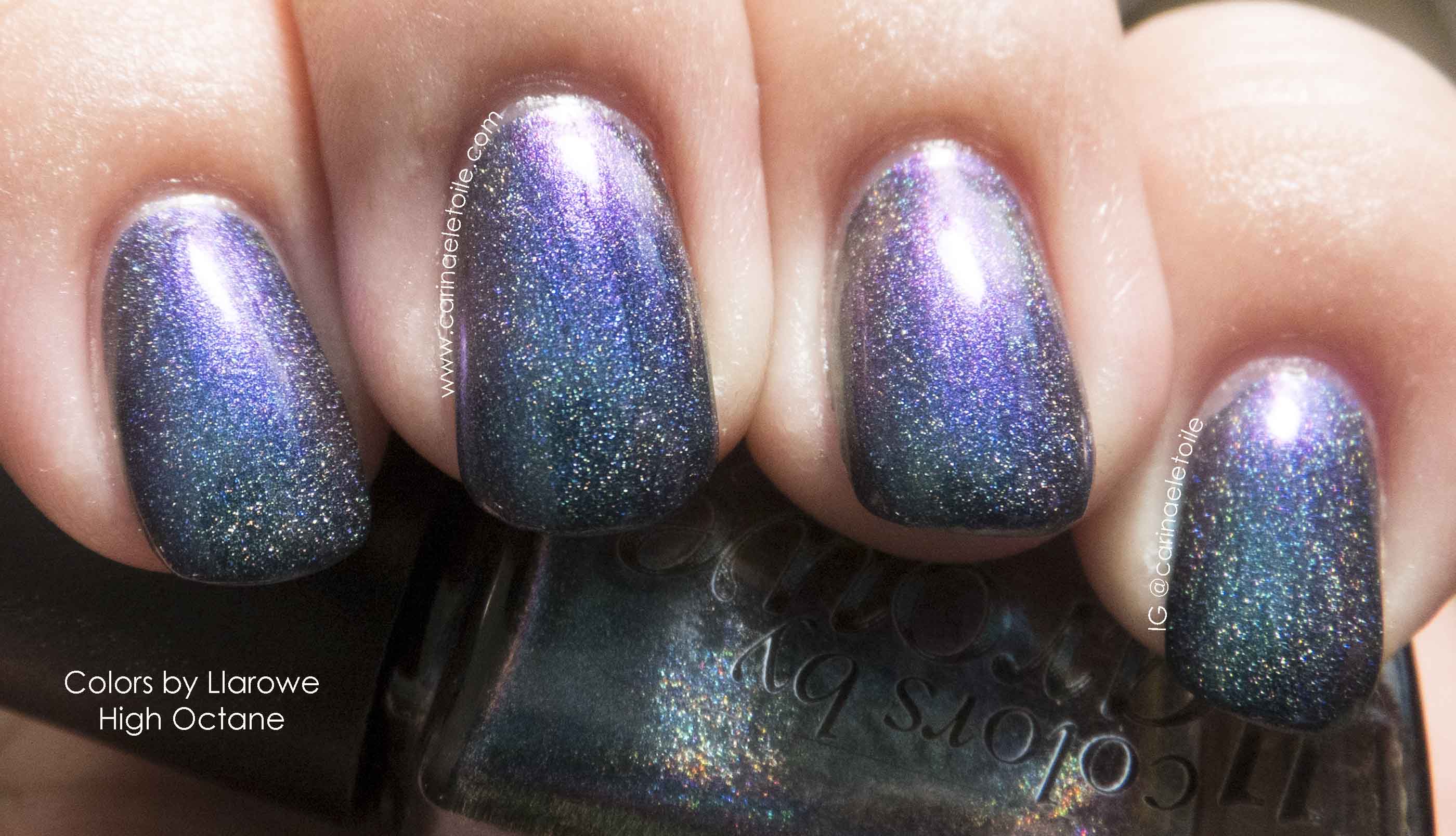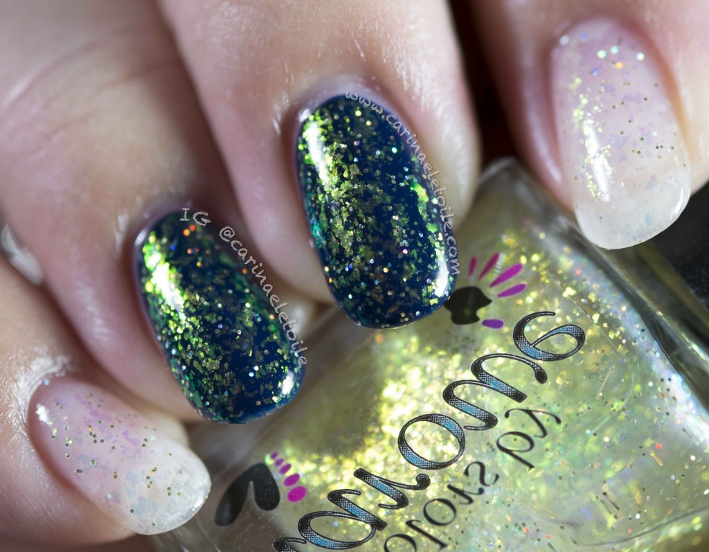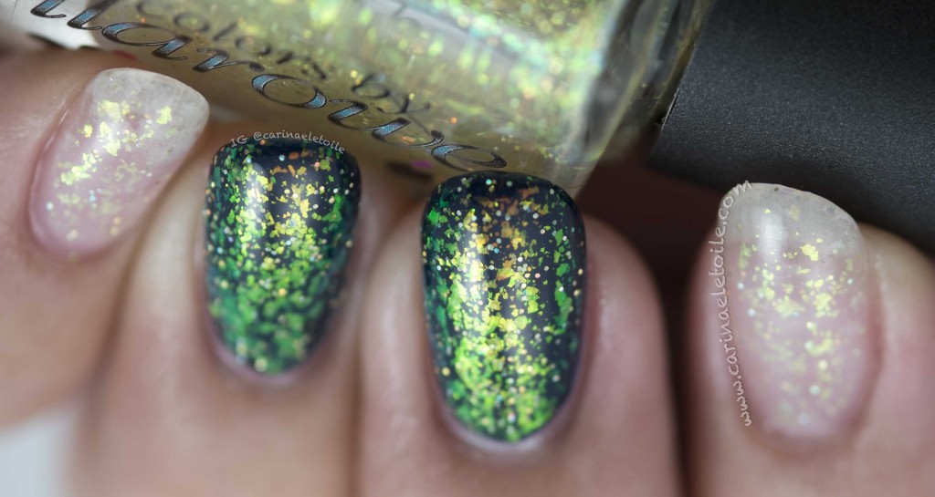 Colors by Llarowe Face of Boe is a great flakie polish that shifts from red, orange, gold, green and yellow in a clear base. There is gold micro glitter thrown in for good measure, but it doesn’t overwhelm the flakies, who are clearly the stars. The micro glitter complements it. I layered Colors by Llarowe Face of Boe over a black polish (my go-to of Sephora Formula X’s Dark Matter) and also applied it over my natural nail.
