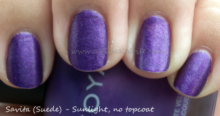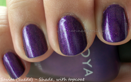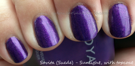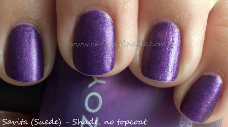 I think I prefer this shade the way it’s meant to be – worn as a suede. Wonder what people will prefer if they buy this shade? What I like about Zoya is that the suede bottles are actually matte so you can find it pretty quickly in your collection if you put all your Zoyas together.