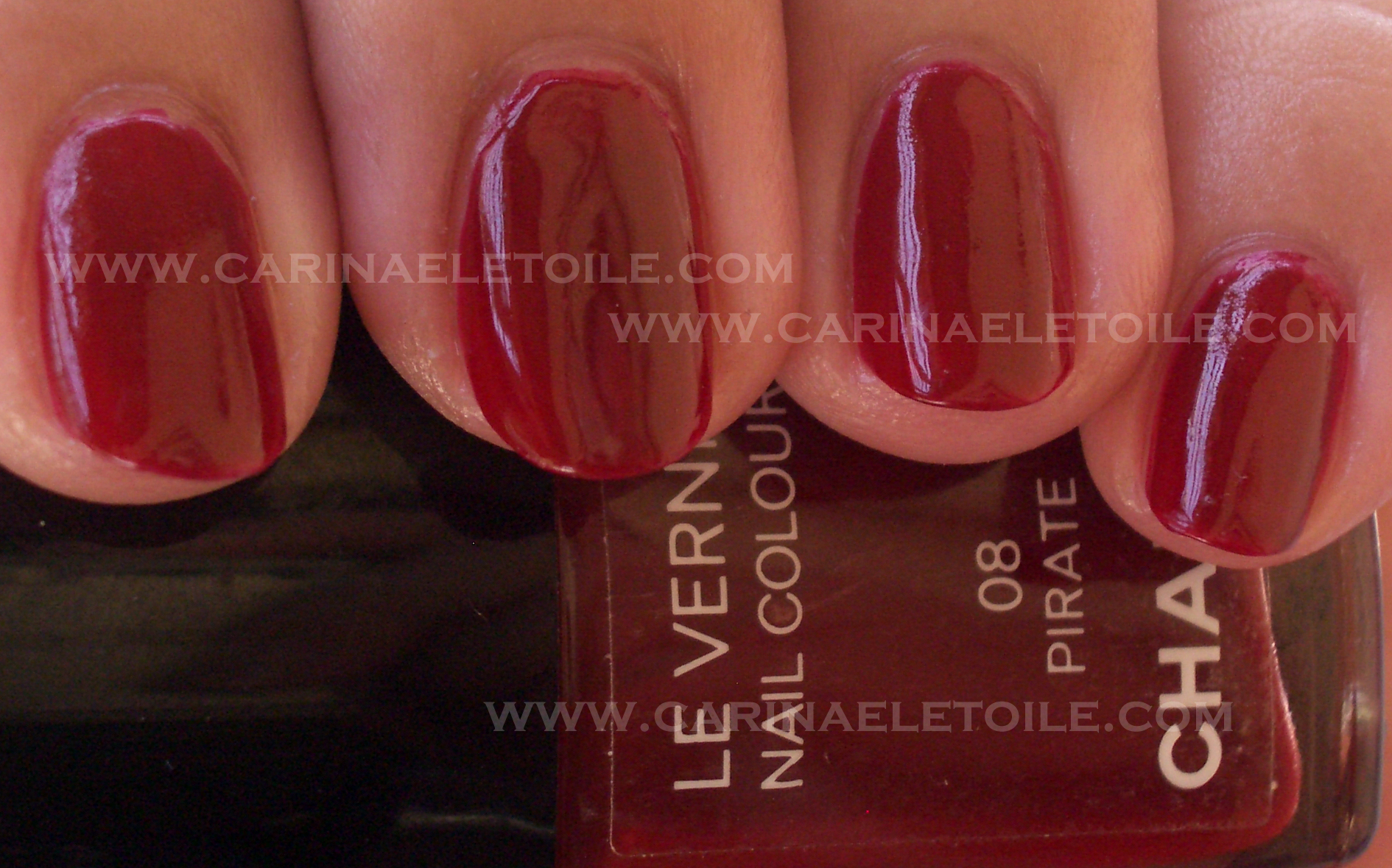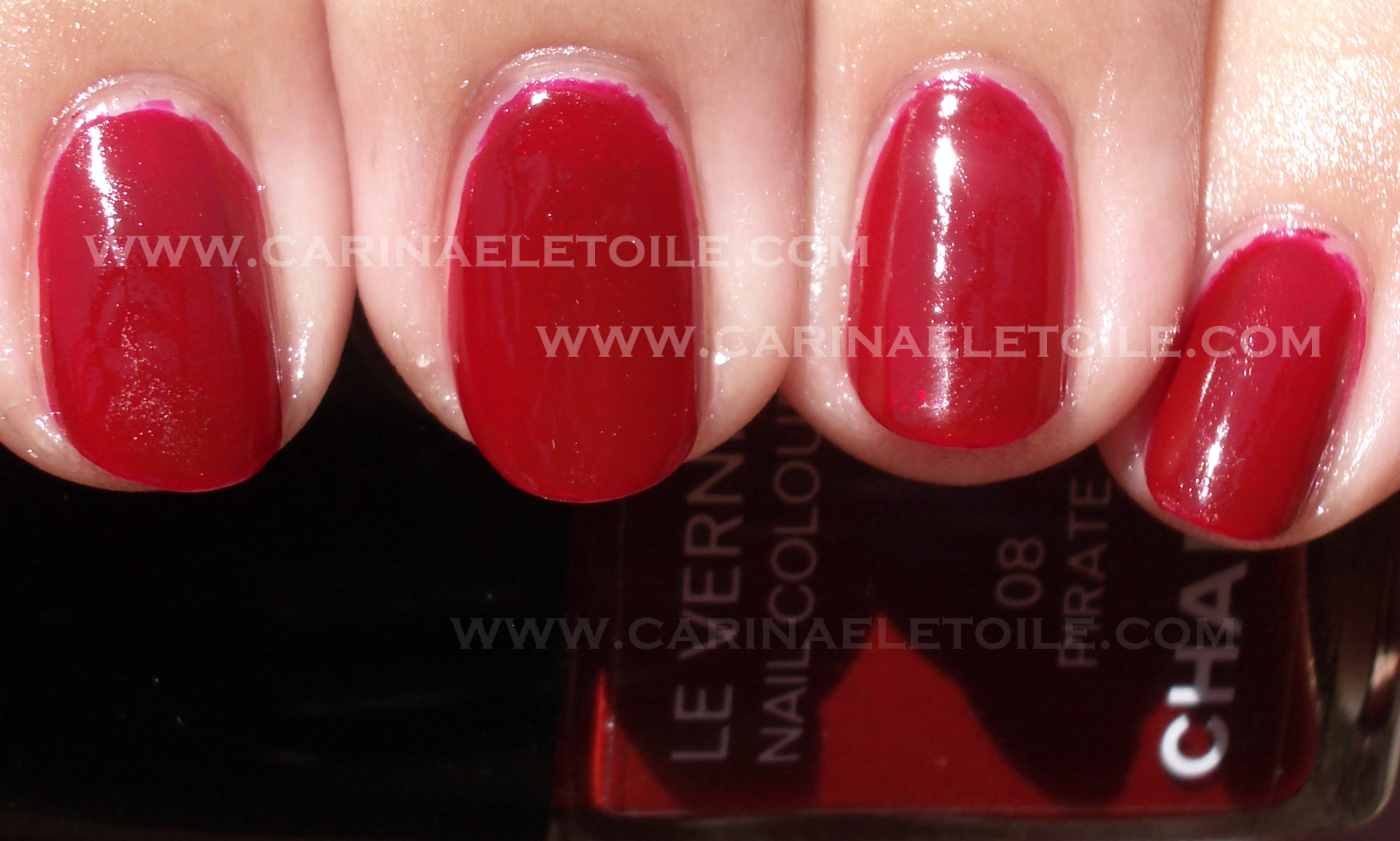 Tuesday, 13 July, 2010I shall focus on what a gorgeous red this is, even though it was a little hard to handle. It didn’t bubble like Violette (thank the heavens!) and it definitely dried faster as well. Unfortunately the color of the nail swatch you will see below has FOUR, yep 4, coats to achieve the color that matched the bottle. They were thin coats albeit because I was worried it was like Violette. No bubbles. Well, there were marginal bubbles, but not as bad as it could’ve been.